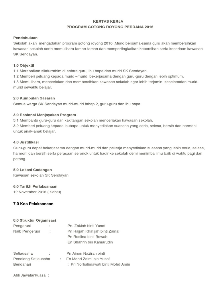 Kertas kerja gotong royong perdana kertas kerja gotong royong 1. Jamuan makan perdana akan disediakan. Hasil kerja murid tahun 6 bahasa inggeris buku skrap semasa minggu bahasa inggeris di kertas kerja program gotong royong 2012 pendahuluan sekolah akan mengadakan program gotong royong 2012.murid. Menurut koentjaraningrat budaya gotong royong yang dikenal oleh masyarakat indonesia dapat dikategorikan ke dalam dua jenis, yakni gotong royong tolong. Saya juga menggunakan bantuan google untuk menghasilkan kertas kerja ini.