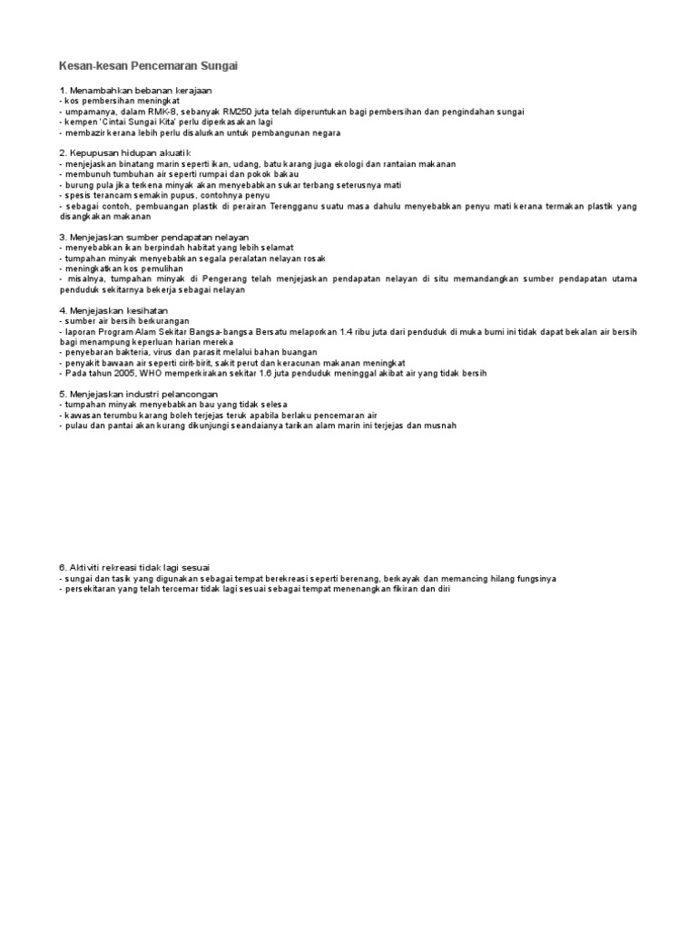 Stesen Janakuasa Dikesan Punca Pencemaran Sungai Langat Enviro Knowledge Center from enviro2.doe.gov.my Pencemaran air memberikan kesan kepada penduduk di alam ini. Menapis dan menyekat sampah pusat rawatan untuk merawat sisa bertoksik daripada. Pembuangan sampah sarap dan sisa kumbahan. Salah satu usaha tersebut telah menyedarkan masyarakat tentang kesan yang timbul akibat daripada pencemaran sungai. Pencemaran air didefinisikan sebagai kehadiran bahan fizikal, kimia, atau biologi di dalam air dalam jumlah besar serta memberi kesan yang melebihi kadar yang ditanggung oleh organisma hidup. Pencemaran sungai masih kerap berlaku meskipun pelbagai usaha telah dilakukan untk membendungnya. Pencemaran sungai mendatangkan banyak kesan negatif terhadap kehidupan. Dengan kata lain kesan atau pendapat kita tentang sekolah.