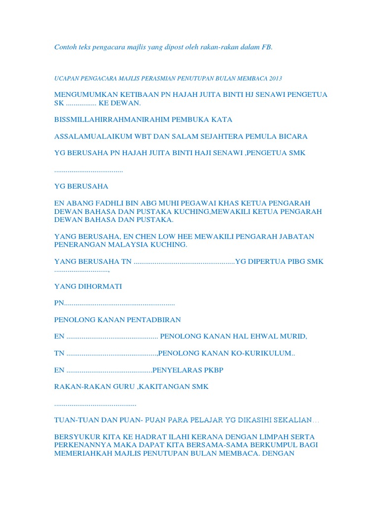 Contoh teks pengacara majlis majlis perkahwinan adha & azwan. Masuk ke perkarangan majlis, para hadirin diminta untuk berdiri. Pergi ke pasar membeli ikan, ikan dimasak diatas bara, selamat datang kami ucapkan, ucapan bismillah pembuka acara. Mengumumkan ketibaan yang berusaha encik nordin bin rukani, penyelia unit kokurikulum, pejabat pelajaran daerah pasir gudang. 4.bertanggungjawab menjadikan majlis berjalan dengan teratur.
