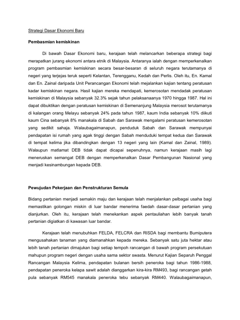 Forum Cabaran Dasar Ekonomi Baru Di Era Malaysia Baru - UMNO from umno.org.my Read this essay on dasar ekonomi baru. Dasar ekonomi baru merupakan satu bentuk perancangan yang dilancarkan oleh kerajaan dalam tahun 1970 melalui rancangan malaysia kedua. Rancangan pembangunan di bawah dasar ekonomi baru dilaksanakan menerusi strategi serampang dua mata iaitu pertama ialah membasmi kemiskinan tanpa mengira kaum. Islam dan ekonomi (hubungan islam dengan ekonomi) ekonomi adalah pengetahuan tentang peristiwa dan tujuan dari manusia dalam memenuhi kebutuhannya atas barang dan jasa adalah untuk mencapai kesejahteraan (weel being). Pembangunan ekonomi adalah berpandukan strategi pengagihan menerusi pertumbuhan dan objektif serampang dua mata dasar ekonomi baru iaitu pembasmian kemiskinan tanpa mengira kaum dan penyusunan semula masyarakat bagi menghapuskan pengenalan kaum mengikut fungsi ekonomi. Deb dilaksanakan atau diperkenalkan pada oleh perdana menteri tun abdul razak dato' hussein kerana reaksi peristiwa rusuhan perkauman pada 13 mei 1969. Dasar ekonomi baru merupakan satu bentuk perancangan yang dilancarkan oleh kerajaan dalam tahun 1970 melalui rancangan malaysia kedua. Deb berjaya menjalankan strateginya dalam menghadapi realiti 'perbezaan etnik' dan dalam usaha mewujudkan keseimbangan dalam pelbagai aspek kehidupan.